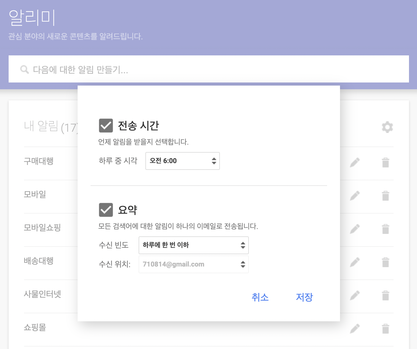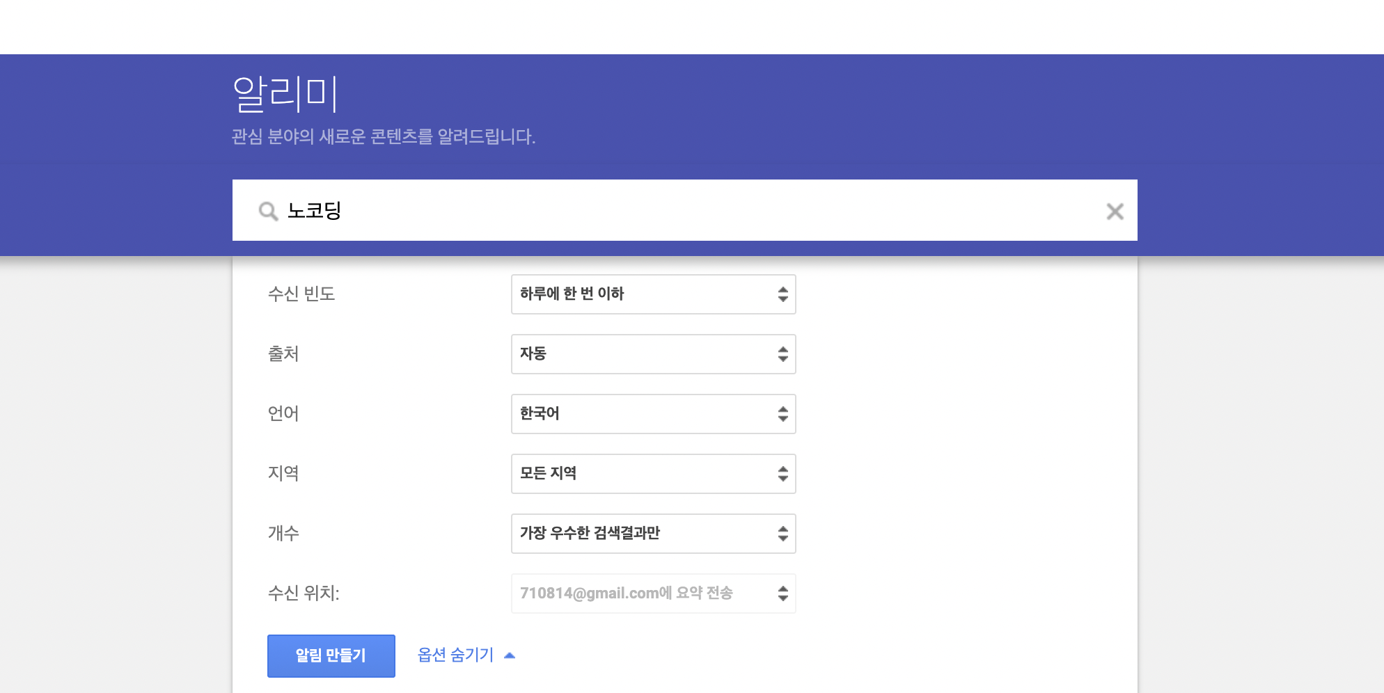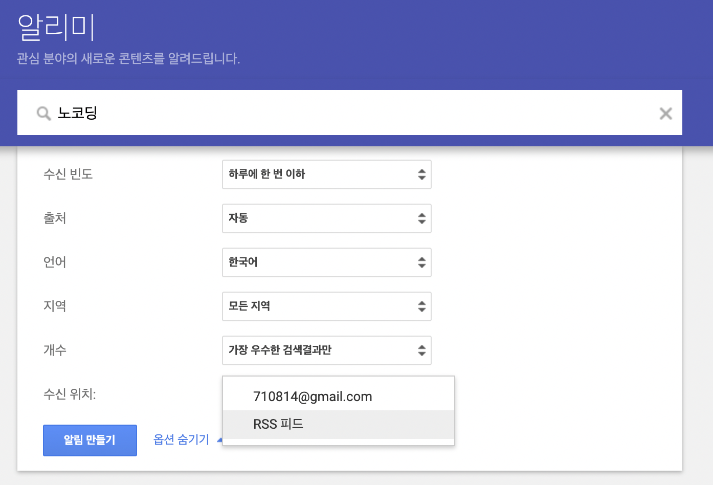 구글 알리미를 통해 뉴스나 정보들을 메일 또는 RSS로 수신할 경우