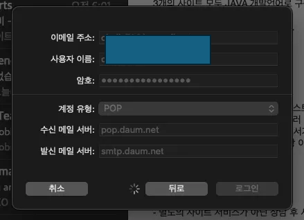 4. 맥 아웃룩 설정에서 복사한 앱 비밀번호를 입력하고 로그인 하면 끝. 계정유형은 POP3로 했는데 다른 유형으로 하나 안되더라구요