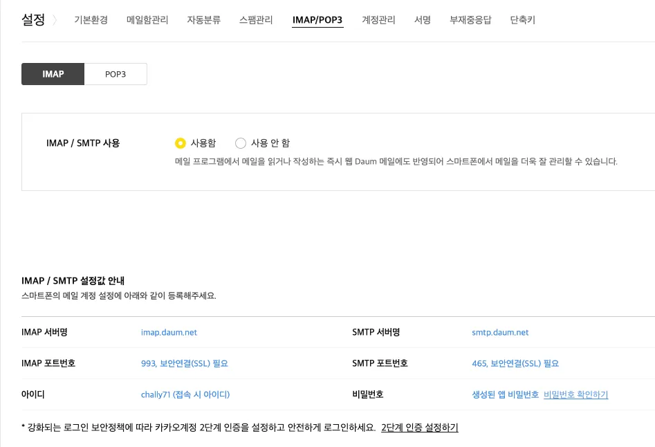 1. 다음메일 설정에서 IMAP/POP3 사용 체크 > '비밀번호 확인하기' 클릭