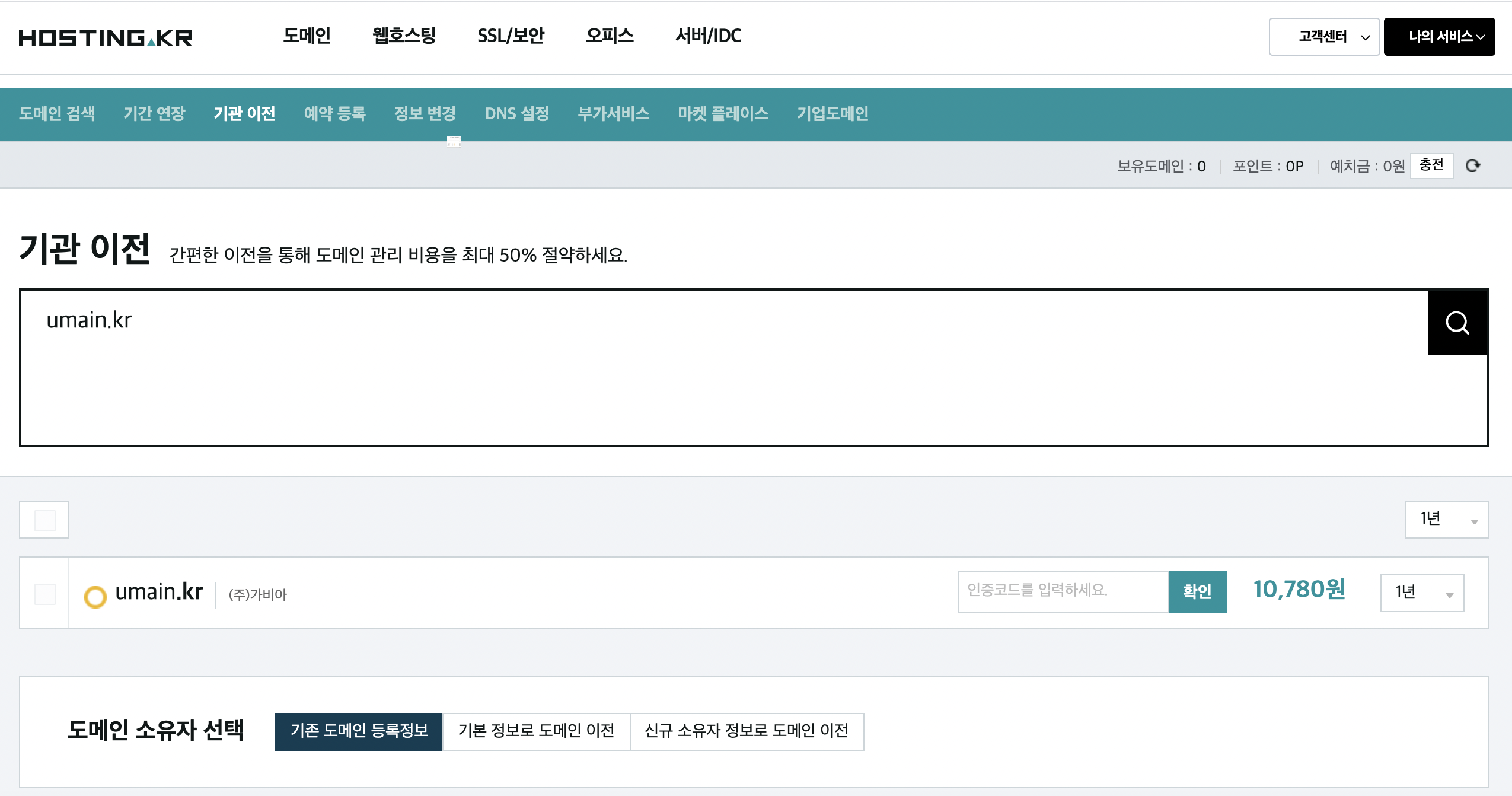 - 국내도메인은 불필요 - 도메인 기관이전 신청과 결제 (신규 등록업체에 기관이전 신청)