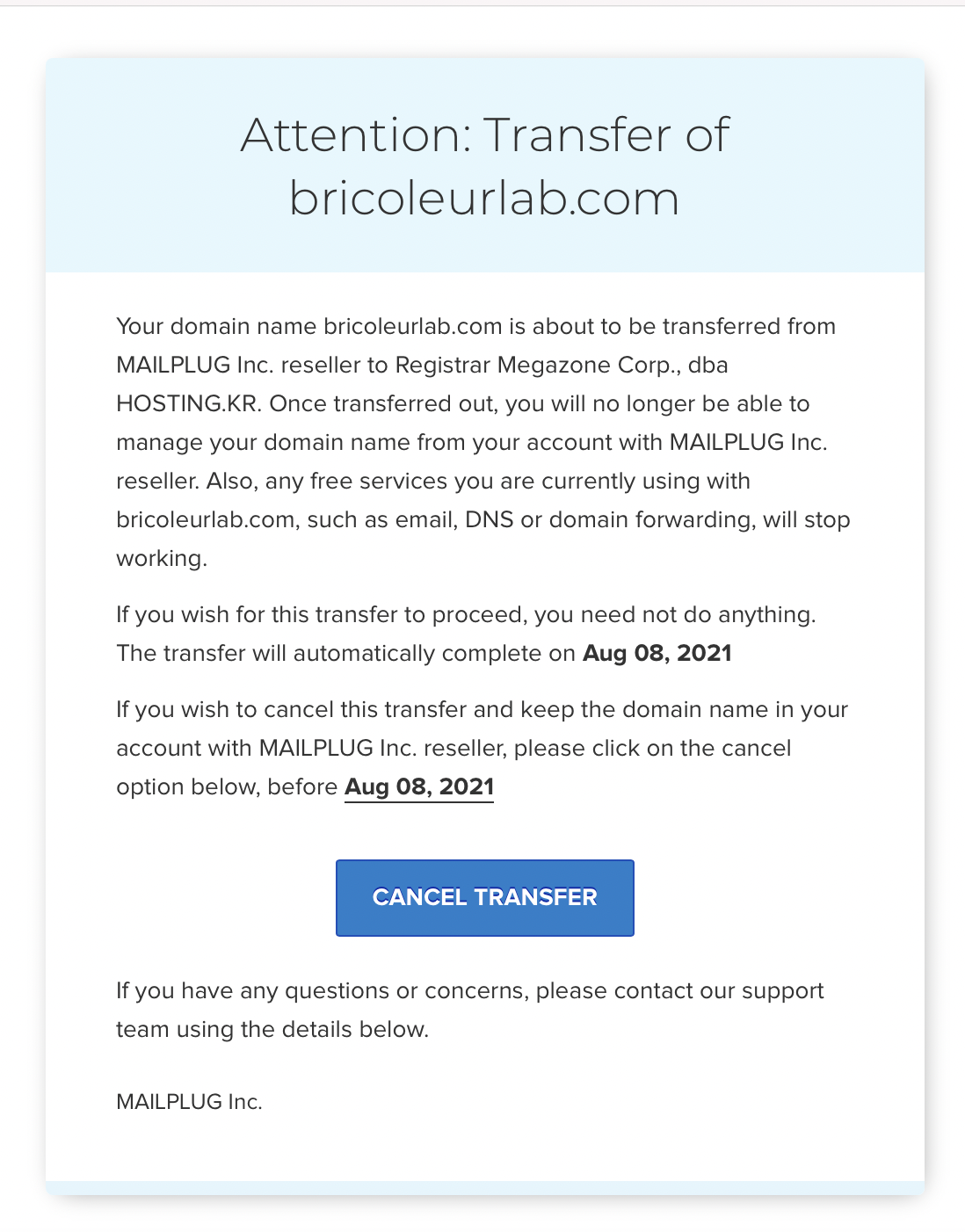 본 도메인 기관이전 확인 메일을 수신하면 이에 대해서 바로 해당 메일에 안내되어 있는 절차 보통은 메일에 특정 링크 클릭 등을 통해 의사를 바로 확인해주는 것이 좋습니다 그렇지 않으면 이전 처리 절차가 수일 더 걸린다고 합니다. 물론 이전 처리를 사정에 의해 취소 하고자 할 때는 이 메일을 통해 최종적으로 이전 취소의사를 전달 하면 됩니다.