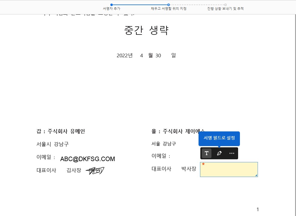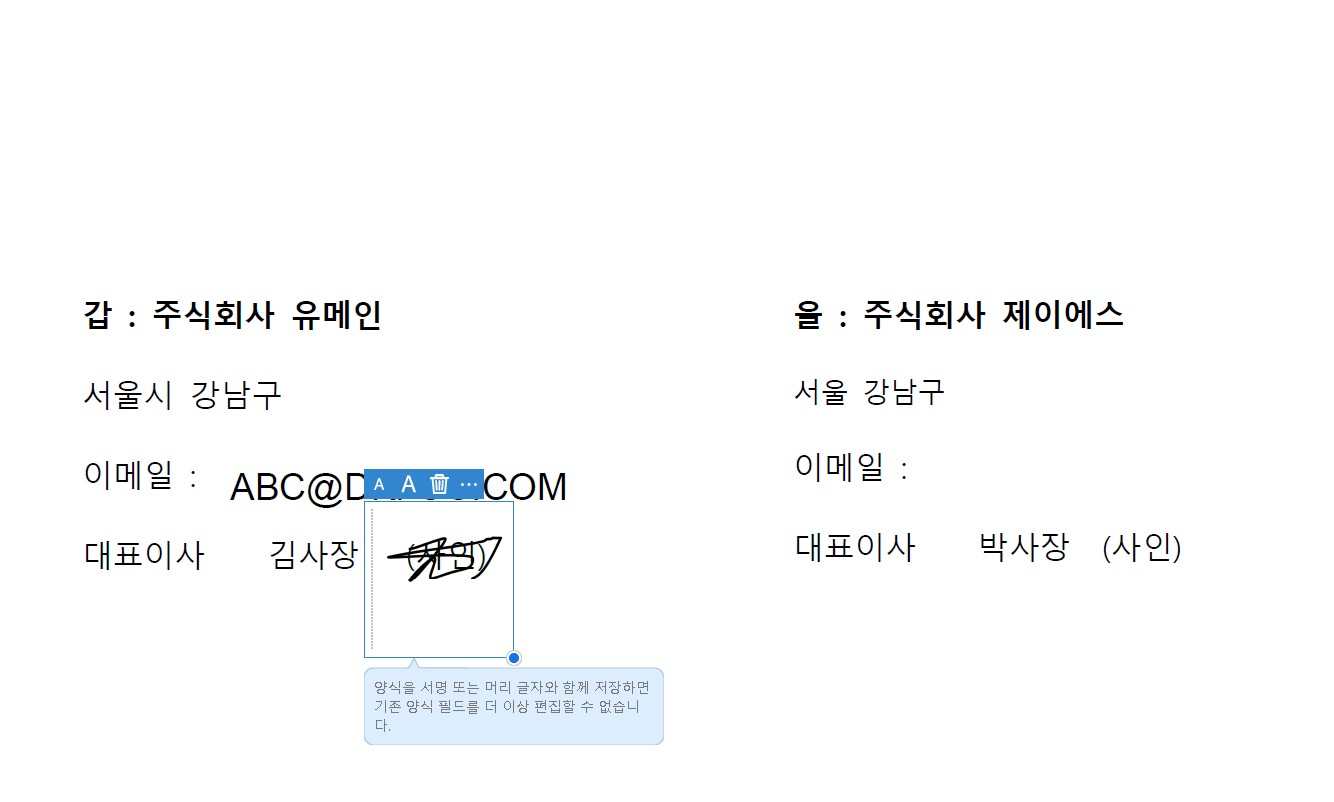 사인할 상대방의 사인이 위치할 곳을 지정하고 서명필드로 설정합니다