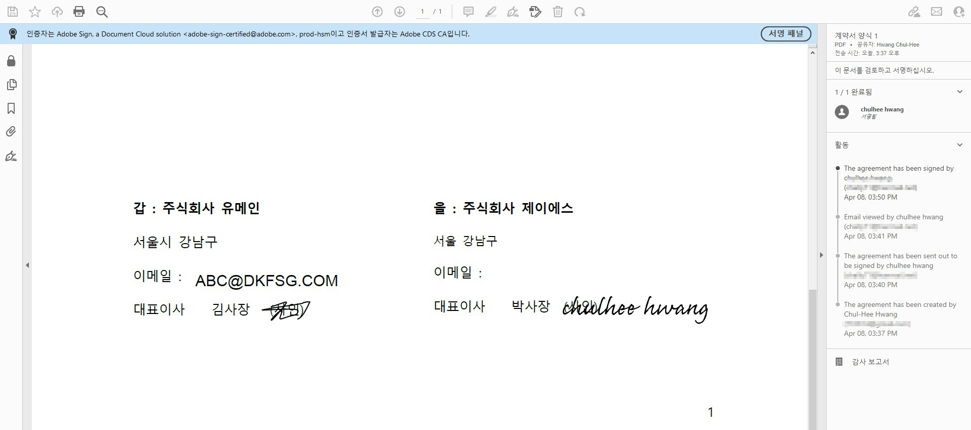 전자계약 문서의 상세 내용을 확인하면 문서가 전송,수신, 사인이 된 시간이 저장되어 있고 어드비의 인증서와 함께 전자계약 문서가 저장되어 있습니다