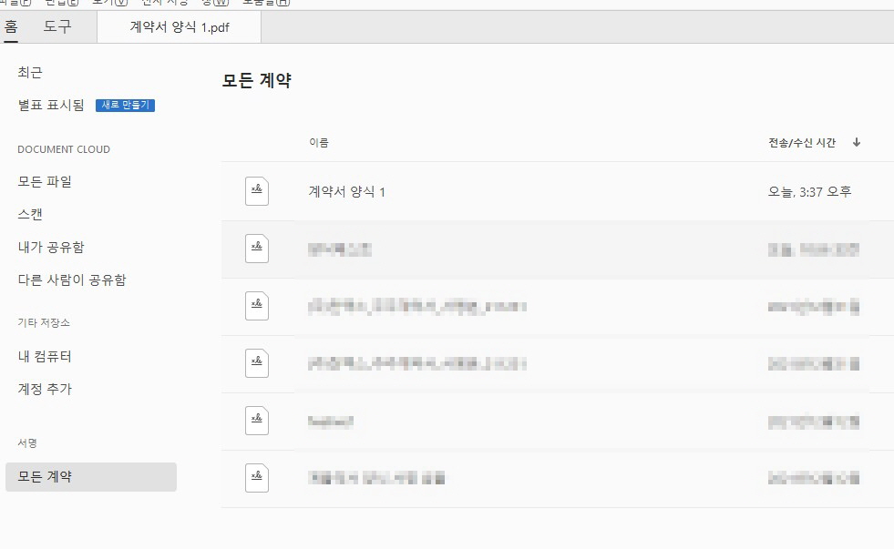이제 어도비 아크로뱃으로 돌아와 좌측에 메뉴중 '모든계약' 메뉴에 들어가 방금 전송했던 전자계약 문서를 확인합니다