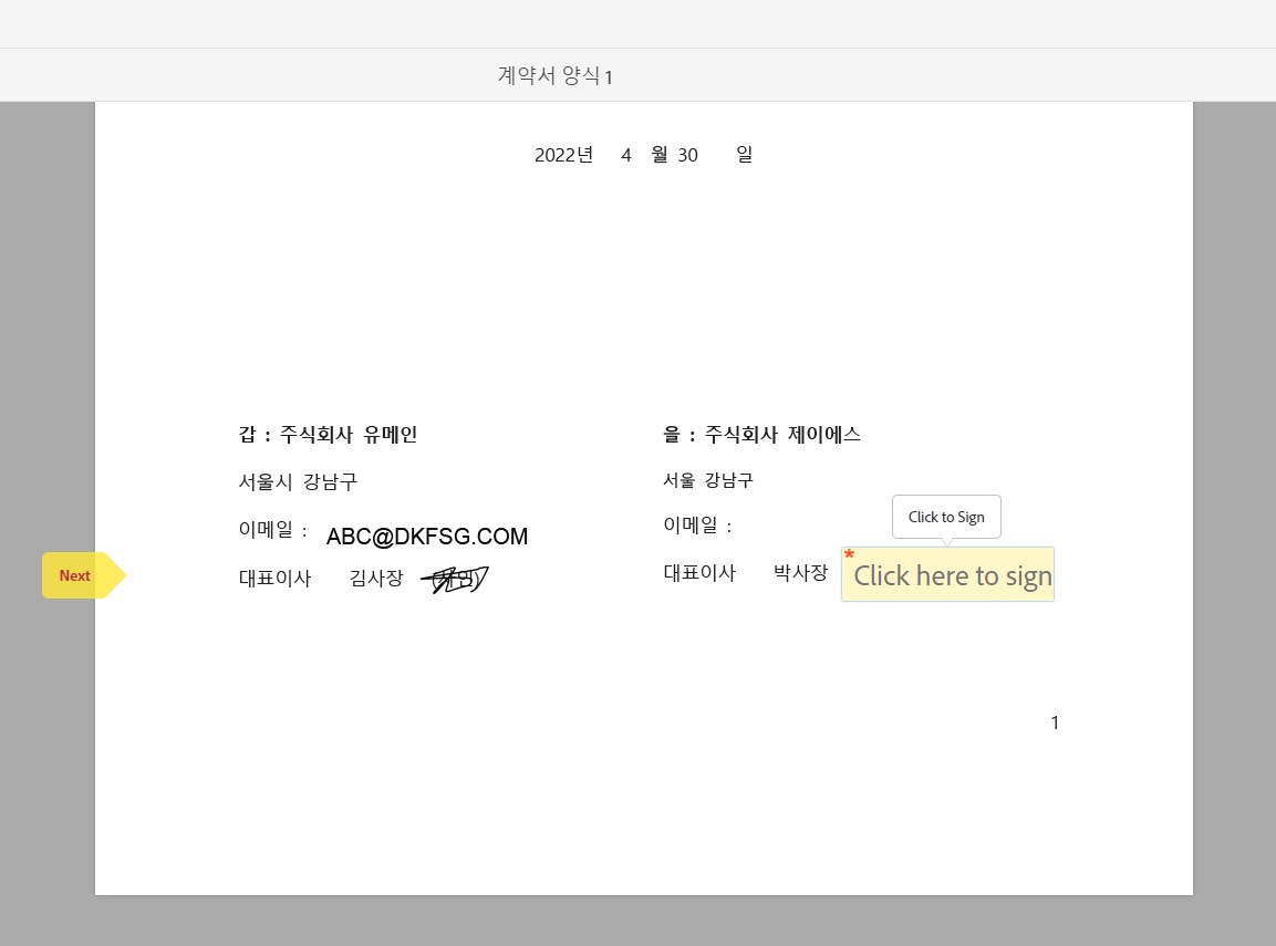 문서를 수신한 상대방은 내용을 확인하고 사인 위치를 확인하고 사인을 완료합니다