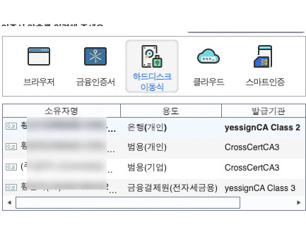 공동인증서, 금융인증서, 간편인증 등등
