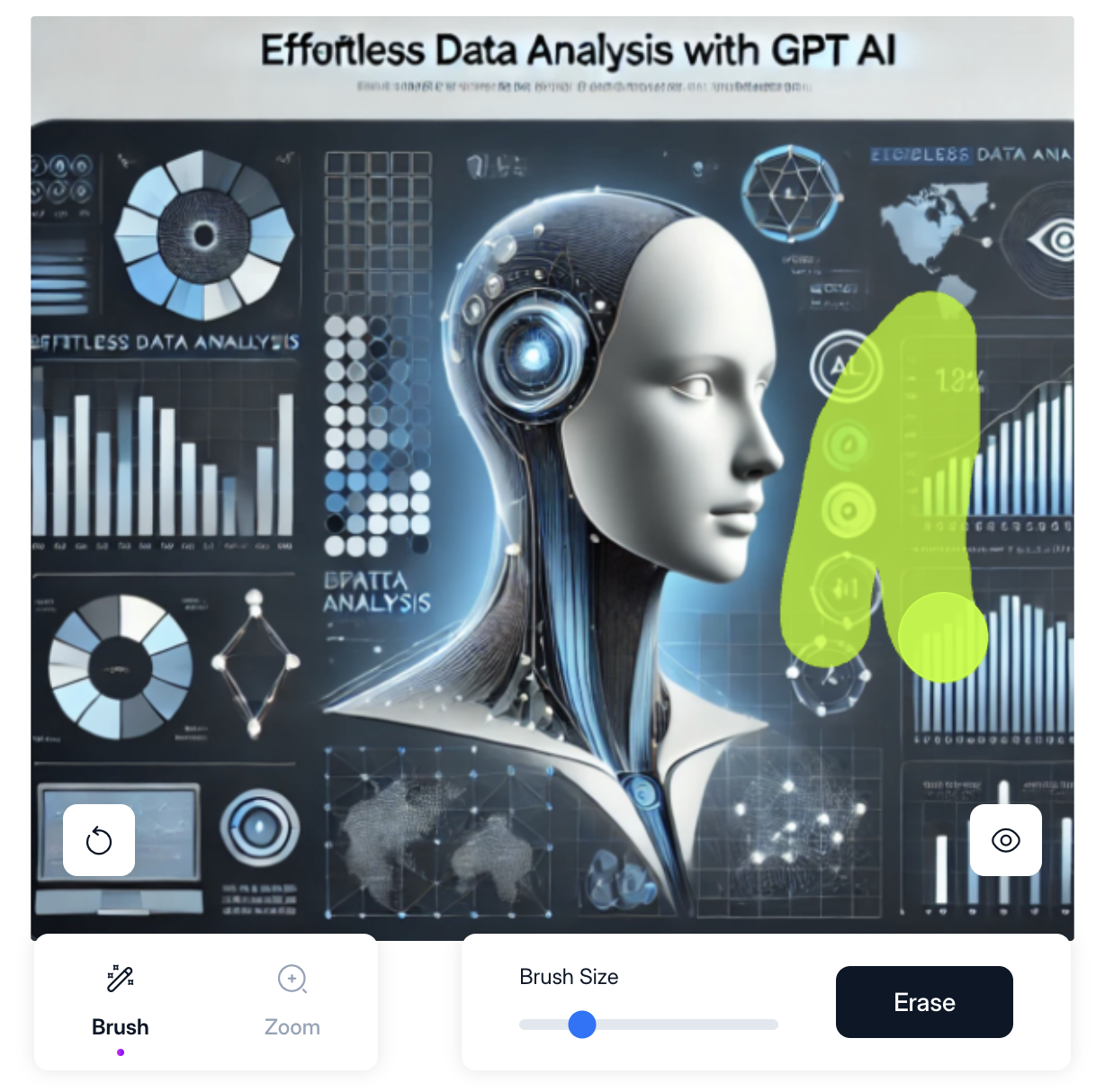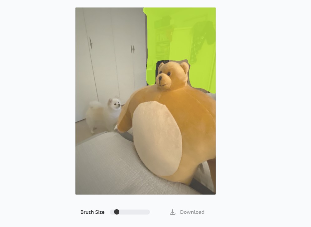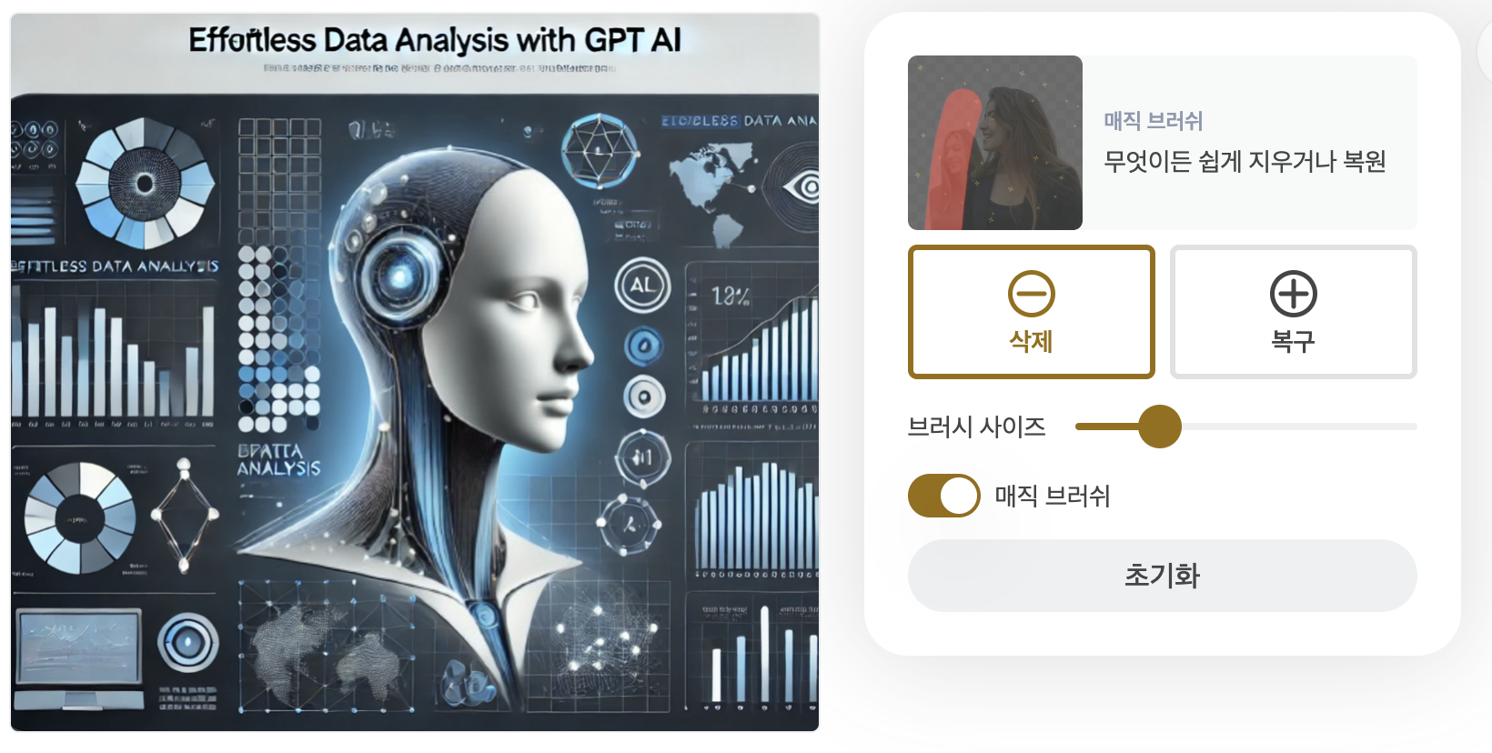배경을 자동 지우는 기능외에 수동으로 일부 이미지를 지우는 기능도 있습니다. '지우기/복원' 을 클릭하면 아래와 같이 수동으로 브러시로 직접 이미지를 지울 수 있습니다.