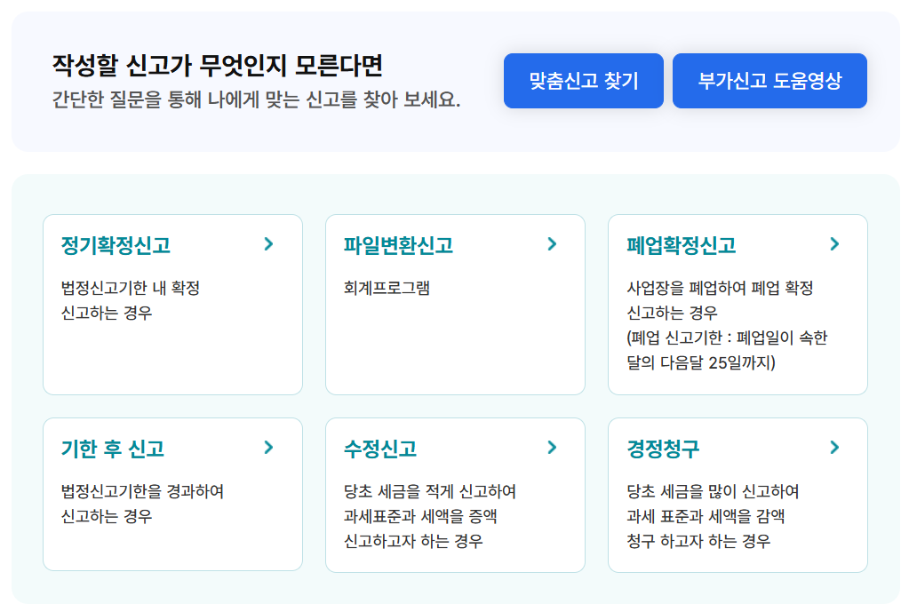 정기확정 신고, 기한후 신고 등 상황에 따라 선택 후 사업자번호를 입력하고 신고 메인 화면으로 진입합니다