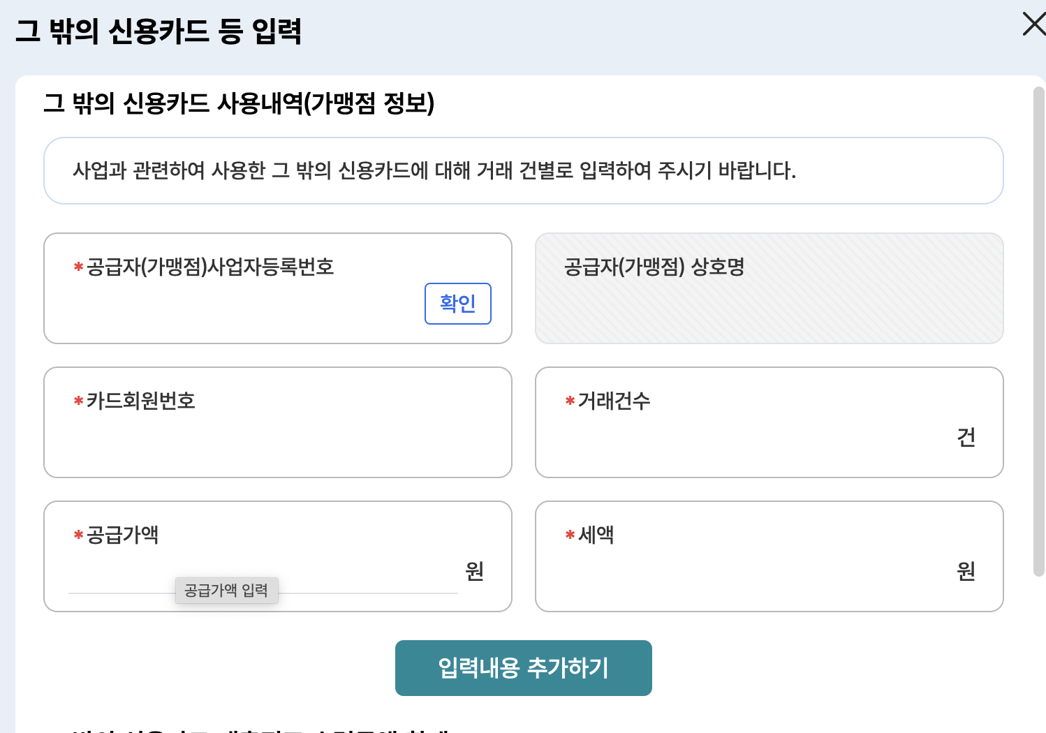 사업용 신용카드 외 신용카드 사용내역 추가 등록 방법