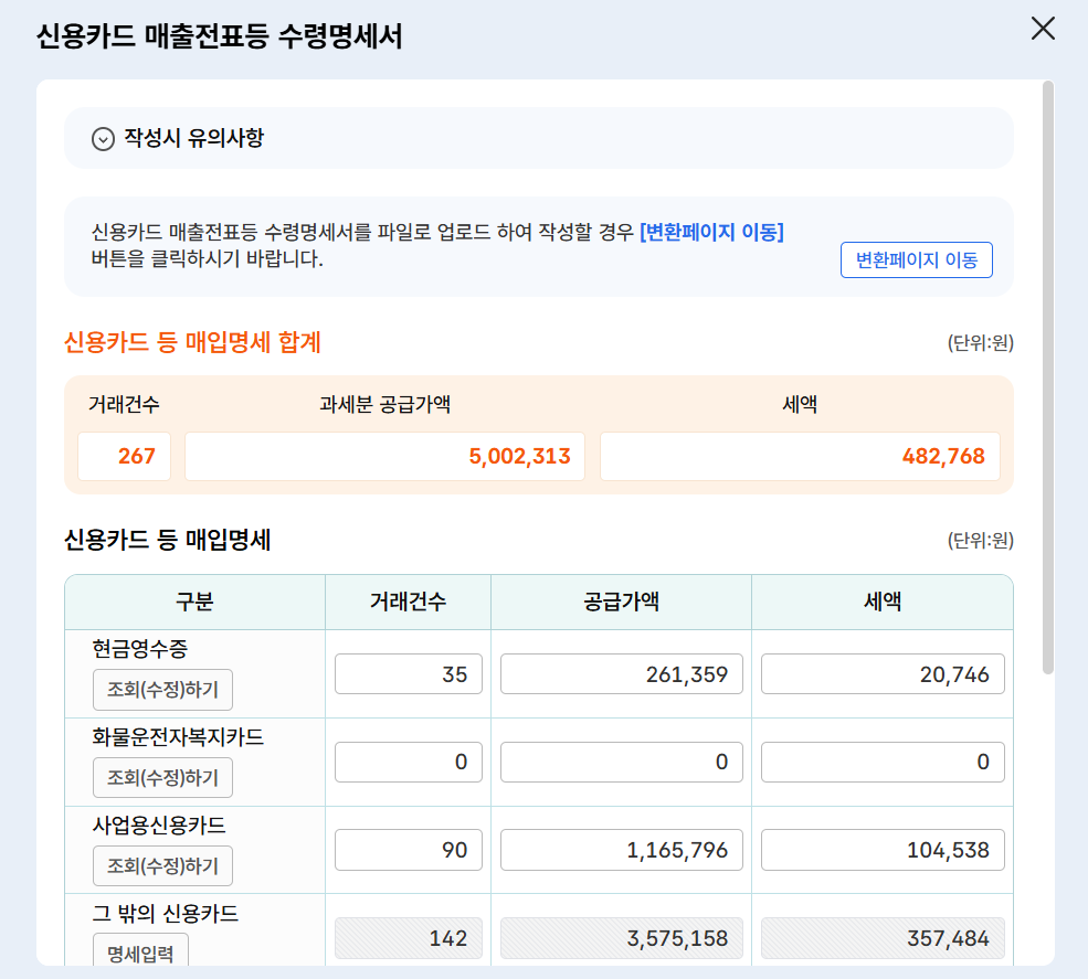 카드 사용 내역을 한 줄씩 입력합니다. 같은 사용처의 경우(사업자 번호 등일한 경우) 합산 등록이 가능하다고 합니다.