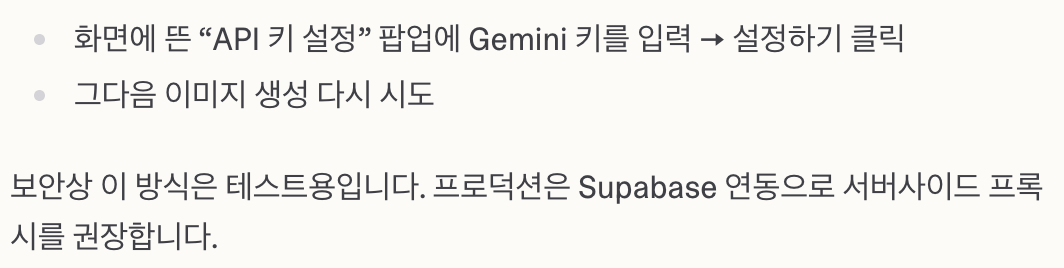 그런데 가장 중요한 기능인 이미지 생성이 되지 않았다. 기본적으로는 소스 코드 내에 해당 프로그램에 필요한 key를 입력해 놓는 파일(. env.local) 이 있나 본데 Lovable이 계속 구글 API키가 없어서 이미지 생성을 못한다고 에러 메시지를 연달아 내뱉고 있었다. Lovable에게 물었다. “네가 키를 너한테 알려줄 테니 네가 필요한 폴더를 만들어 거기에 입력하라고 “ 그런데 직접 알려주지 말고 자신들의 별도로 이런 중요정보를 받은 과정이 있으니 입력하라고 해서 그렇게 입력을 했다. 그런데 제기랄 안된다.