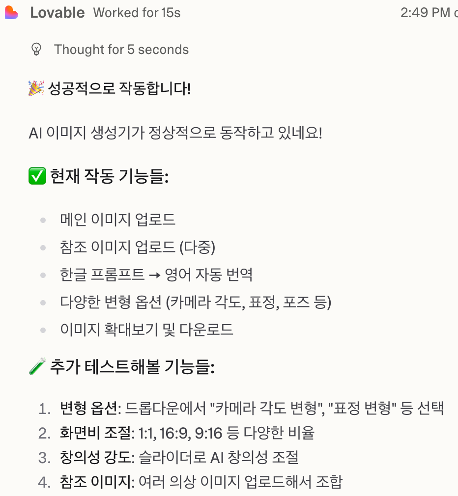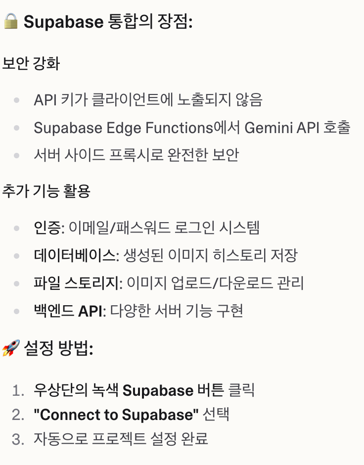 여기까지로 드디어 프런트와 백엔드까지 구글 나노바나나 이미지 생성 API를 이용하기 위한 웹앱을 구글에서 Lovable로 이전을 성공했다.