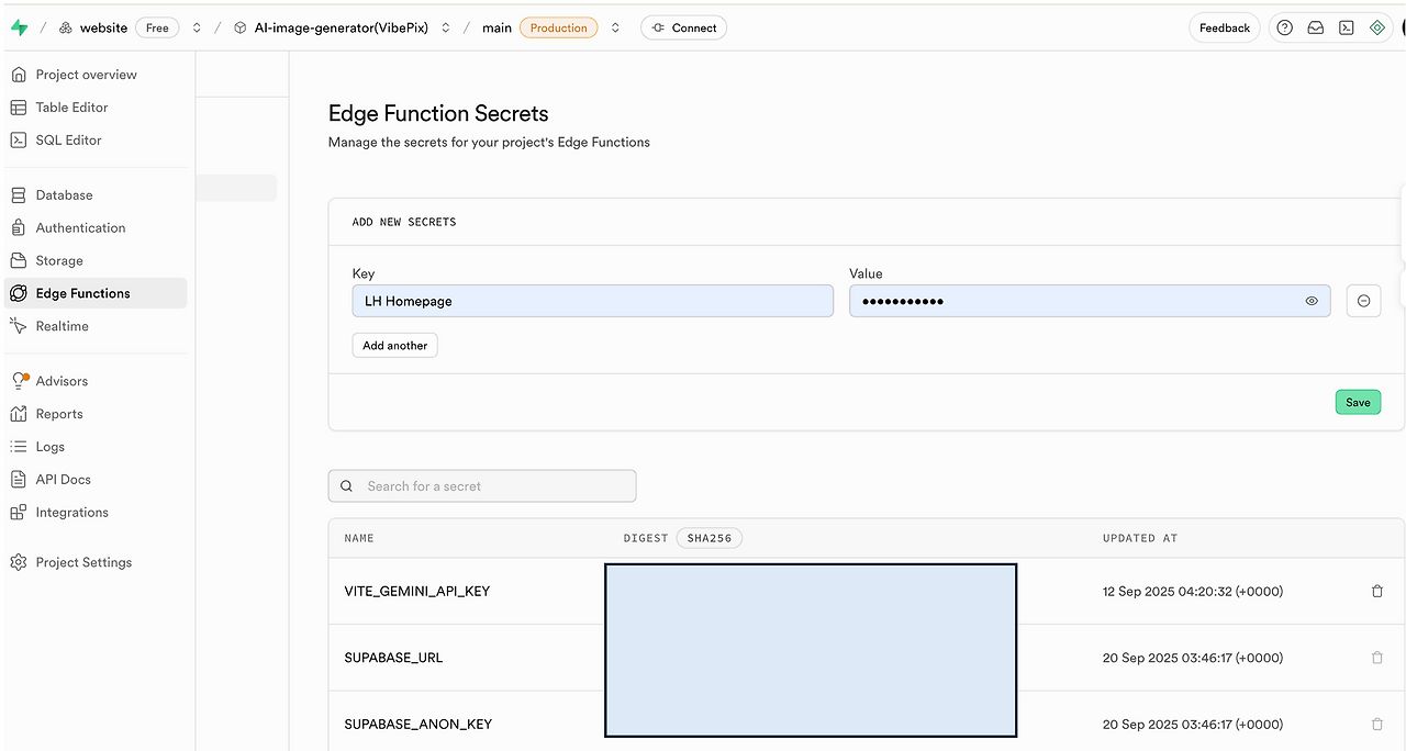 직접 로컬 파일에 중요한 KEY정보를 입력하는 것이 분명 문제가 있을 것 같아 Lovable이 제시하는 Lovable이 기본적으로 연동을 지원하는 Supabase 사이트에 해당 프로젝트 설정 페이즈를 둘러봤다. 그런데 쉽게 찾을 수는 없었다.