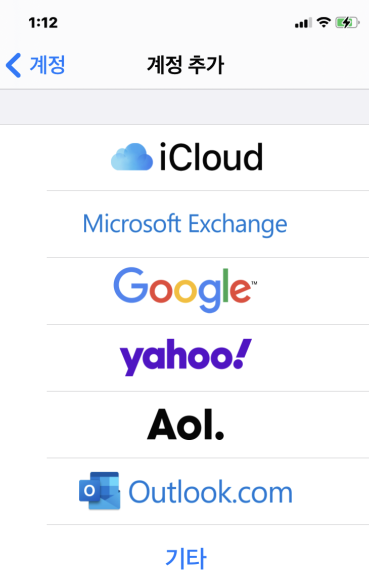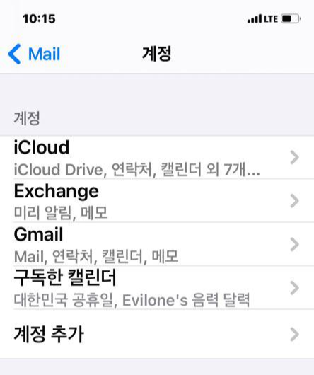 - 설정 > Mail > 계정 > 계정추가